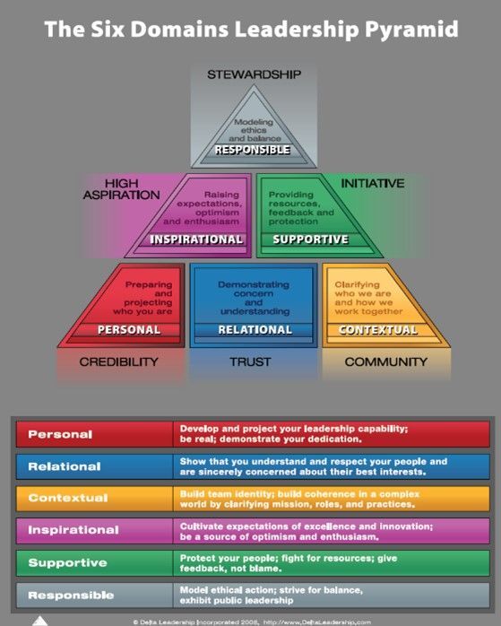 As the name implies, the Six Domains of Leadership or SDL frames leadership into six domains of leader behavior that yield results (leadership effects) that the leader aims to achieve. It is represented by a pyramid that highlights the interdependence among the domains.